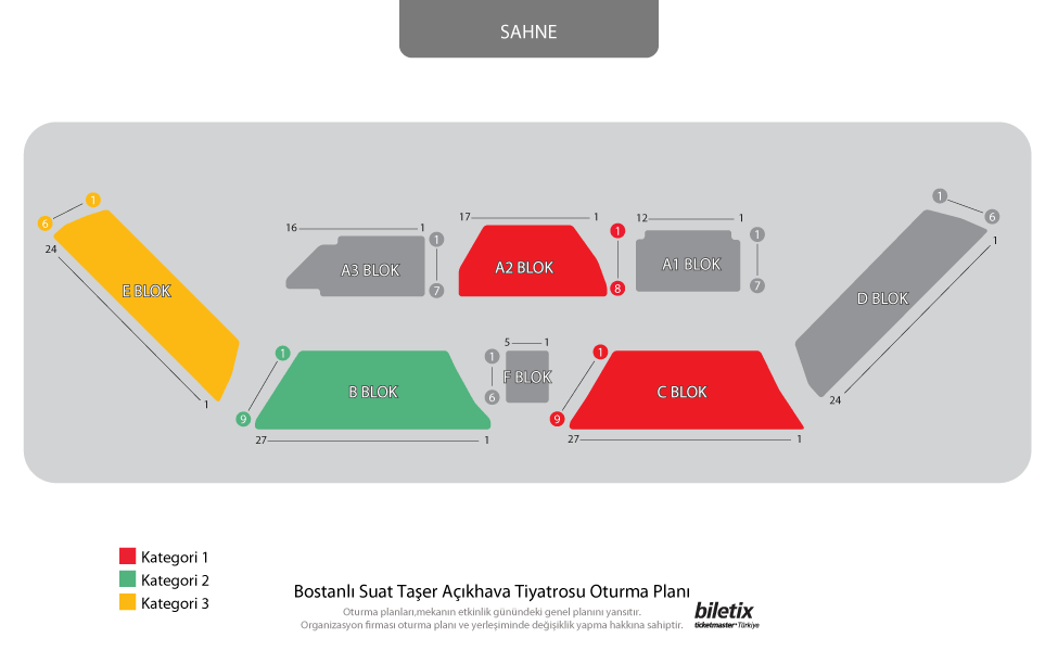 Etkinliğe gitmek istediğiniz tarih ve saati belirledikten sonra bilet adedini ve fiyatını seçin. Birden fazla fiyat kategorisi olan etkinliklerde sağ taraftaki oturma planından yararlanabilirsiniz. Her fiyat kategorisinden ve bloktan bilet satışı olmayabilir.