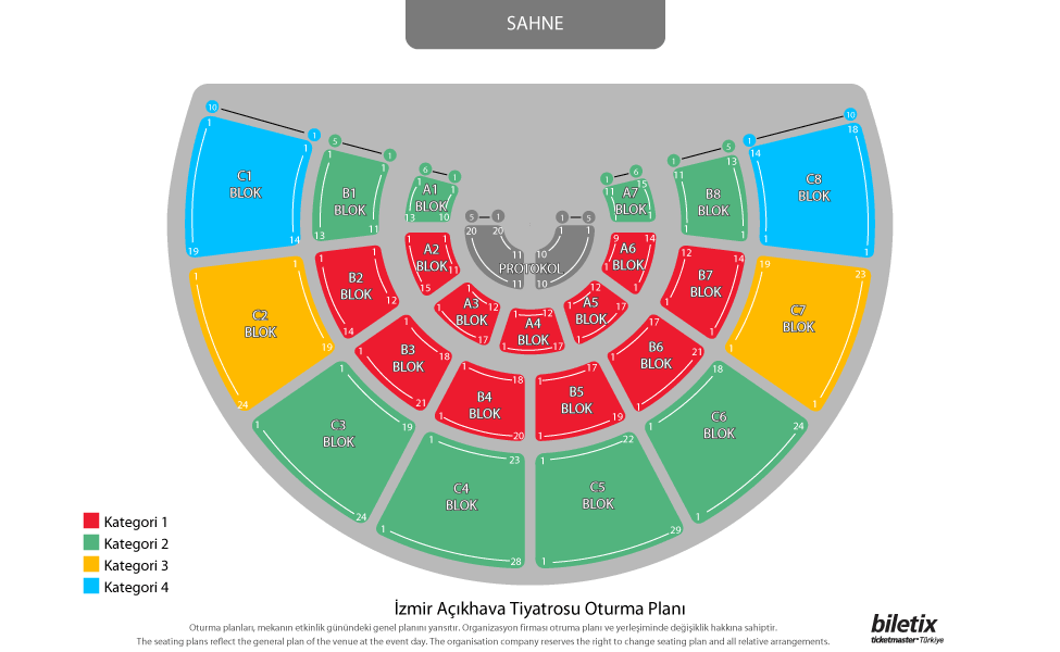 Etkinliğe gitmek istediğiniz tarih ve saati belirledikten sonra bilet adedini ve fiyatını seçin. Birden fazla fiyat kategorisi olan etkinliklerde sağ taraftaki oturma planından yararlanabilirsiniz. Her fiyat kategorisinden ve bloktan bilet satışı olmayabilir.
