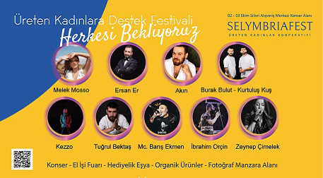 Üreten Kadınlar Kooperatifi organizatörlüğünde Selymbriafest, 2 Ekim Cumartesi ve 3 Ekim Pazar günü Silivri Alışveriş Merkezi Konser Alanı’nda değerli sanatçılarla ve birbirinden güzel etkinlikler ile sizlerle buluşuyor.