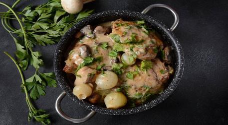 - Tavuk Fricasse, havuç, soğan ve mantar sosu ile