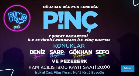 Youtube’un en sevilen Talk Show programı “P!NÇ” Oğuzhan Uğur’un sunumuyla ve sürpriz konuklarıyla, kendi sahnesinde “Pinç Pub’ta” seyircisiyle buluşuyor.
