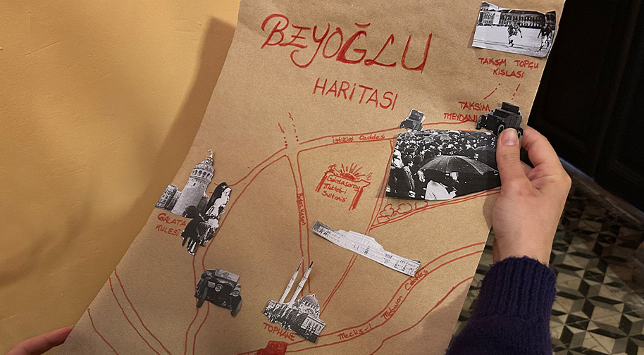 Participants work on the interesting elements of old Istanbul's social life, such as public transportation, educational buildings, sports and cultural areas, after a guided exhibition tour for the workshop, inspired by the urban components of the daily life of Occupied Istanbul. Afterwards, the par