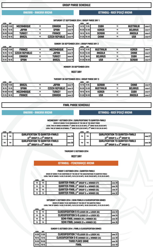 The groups phase and the qualification games for the quarter finals will be played in Ankara and Istanbul from September 27th until October. Istanbul will host the finals from October 3rd until October 5th.